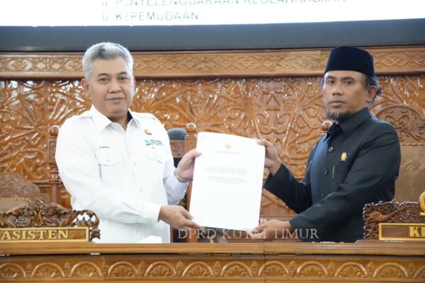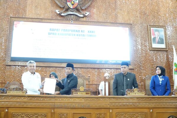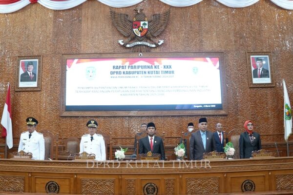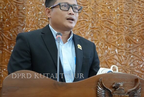 BP 40 – Pimpinan rapat ketua DPRD Kutai Timur Jimmi didampingi Wakil Ketua II Prayunita Utami memberikan kesempatan atau giliran ketiga Fraksi Nasdem DPRD Kabupaten Kutai Timur menyampaikan pandangan umumnya terhadap dua Rancangan Peraturan Daerah (Raperda) penting, yaitu tentang Penyelenggaraan Keolahragaan dan Kepemudaan, dalam Rapat Paripurna DPRD. “Dalam rapat paripurna yang berlangsung diruang siding utama…