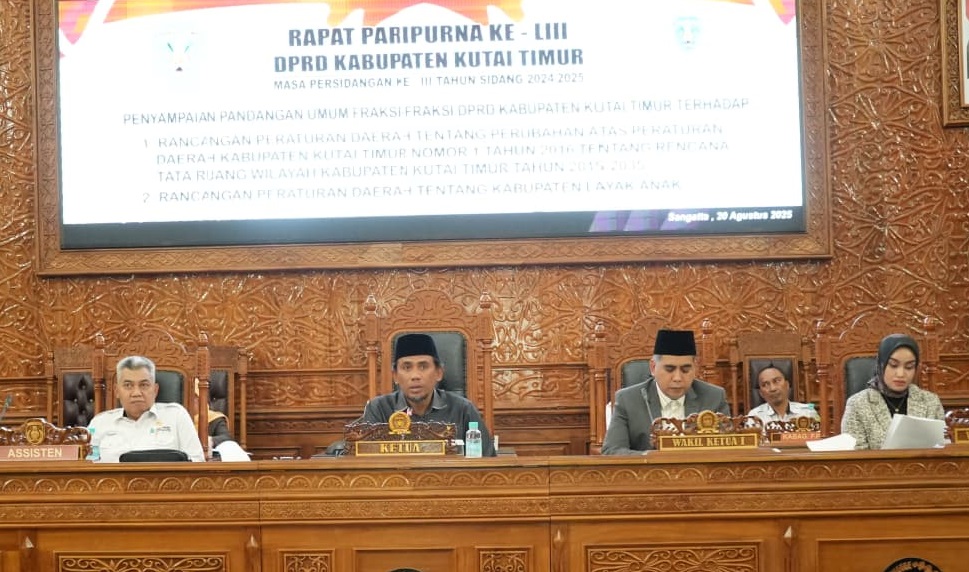 DPRD KUTAI TIMUR, Rabu, 20/8/2025 ) – DPRD Kutai Timur menggelar rapat paripurna penyampaian pemandangan umum fraksi-fraksi terhadap dua Rancangan Peraturan Daerah (Raperda), Rabu (20/8/2025). Sidang dipimpin Ketua DPRD Jimmi, didampingi Wakil Ketua Sayid Anjas dan Hj. Prayunita Utami, serta dihadiri unsur Forkopimda, OPD, dan undangan lainnya.