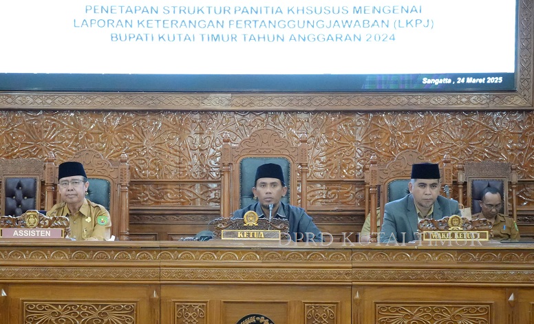 BP 40 – Ketua DPRD Kutai Timur, Jimmi, ST., MT, kembali memimpin rapat paripurna Ke XXXIV masa Persidangan II Tahun Sidang 2024/2025 dengan agenda utama penetapan struktur Panitia Khusus (Pansus) Laporan Keterangan Pertanggungjawaban (LKPJ) Bupati Tahun Anggaran 2024. Rapat ini berlangsung di ruang sidang utama DPRD Bukit Pelangi, pada Senin, 24 Maret 2025.